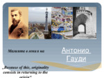 Материалът има за цел да представи визуално информация за великият майстор в архитектурата, като набляга на уникалният стил на Гауди и ключови моменти от живота и творчеството му. Презентацията очертава и обобщава с какво ще запомним неговите шедьоври...