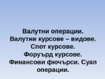 Валутни операции. Валутни курсове – видове. Спот курсове. Форуърд курсове. Финансови фючърси. Суап операции...