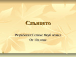 Слънцето е най-близката до нас звезда намираща се на 150 млн. км. от Земята в центъра на нашата Слънчева система. Температурата на повърхността му е 6000 C, а в централната част е 15 милиона градуса. Светлината от него достига до нас за 8 минути....