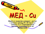 Презентация на тема мед (Cu) химичен елемент. Разказва за свойствата на медта - химични и физични, история на метала и интересни факти...
