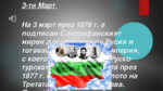 На 3 март през 1878 г. е подписан Санстефанският мирен договор между Русия и тогавашната Османска империя, с което се слага край на Руско-турската война, започнала през 1877 г. и се поставя началото на Третата българска държава...