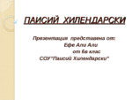 Паисий Хилендарски. Монах от от българския манастир в Атон. Там написал История славянобългарска. Докато събирал помощи за манастира в България, давал книгата на родолюбиви българи да я преписват. В нея описал силата на българската държавност и...
