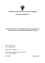 Работа има за цел чрез разглеждане и анализ на Гръцкият проект да се аргументира тезата на автора, че политиката на Русия по Източният въпрос, не преследва определени, териториални придобивки, а се основава на културно-цивилизационни мотиви...