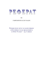 В настоящият реферат се засяга организацията на установяването на поръчков метод за калкулиране себестойността на продукцията в ООД “Елена” град Сливен. Предмета на дейност на фирмата е: производство на мъжки и дамски костюми...