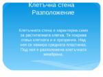 Клетъчната стена е характерна само за растителната клетка. Тя покрива отвън клетката и е прозрачна. Над нея се намира средната пластинка. Под нея е разположена клетъчната мембрана. Изградена е от полизахариди (целулоза, хемицелулоза и пектини)...