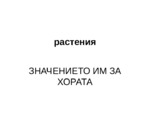 Презентацията е предназначена за ученици от основен курс на обучение. Разглежда значението на растенията за хората - за храна, здравословни ползи, лечебни растения и разпространение...