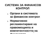 Презентация на тема финансов и данъчен контрол, предназначена за ученици. Органи по контрола с обща компетентност са тези, които по право упражняват контрол като продължение на техните управленски функции....