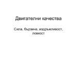 Сила, бързина, издръжливост, ловкост. Спортната дейност е свързана с извършване на разнообразни по структура и времетраене движения, изпълнявани с необходимата бързина (скорост)...