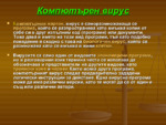 Компютърния жаргон, вирус е саморазмножаваща се програма, която се разпространява като вмъква копия от себе си в друг изпълним код (програми) или документи...