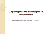 Същност и обхват на пазарните проучвания, пазарни характеристики. Насочват се към организацията и провеждането на всички дейности по набирането, обработването и анализирането на данните отнасящи се до пазарните процеси в бизнеса...