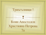 Триъгълникът е една от основните фигури в геометрията. Представлява двуизмерна фигура, многоъгълник с три страни и три ъгъла...