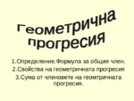 Определение. Формула за общия член. Свойства на геометричната прогресия. Сума от членовете на геомтричната прогресия...