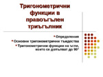 Тригонометрични функции в правоъгълен триъгълник. Определения. Основни тригонометрични тъждества. Тригонометрични функции на ъгли, които се допълват до 90°...