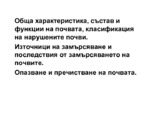 Обща характеристика, състав и функции на почвата, класификация на нарушените почви. По-голяма част от повърхността на континентите е покрита с почва. Тя осигурява условия и минерални вещества за развитие на растенията...