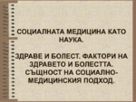 Презентация от социалната медицина предназначена за студенти. Здраве и болест. Фактори на здравето и болестта. същност на социално-медицинския подход...